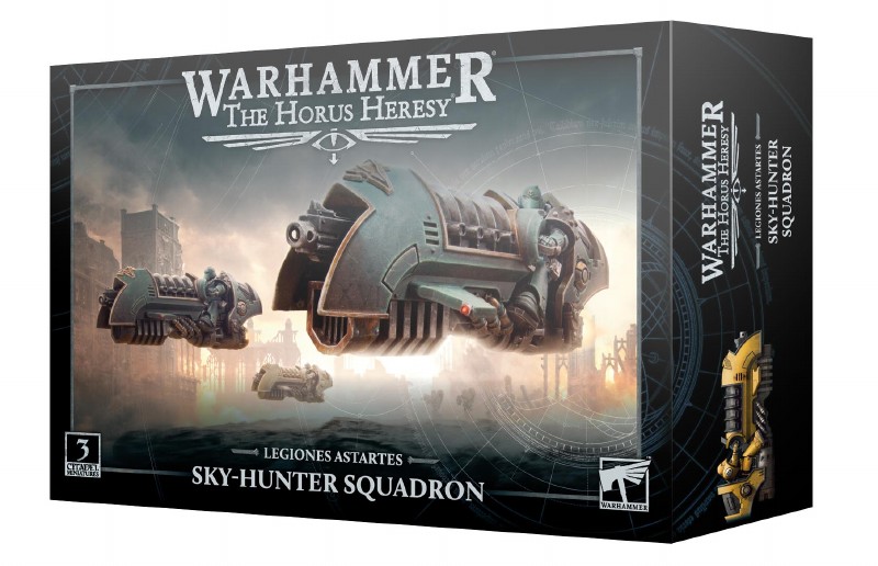 This multipart plastic kit builds three Sky-hunters - skilled Legionaries mounted on high-speed jetbikes. Each bike can be armed with a choice of heavy bolter, multi-melta, plasma cannon, or volkite culverin, and comes with optional sigils for Loyalists and Traitors, as well as accessories such as pistol holsters, sheathed chainswords, and an augur device and stowed helmet. The Space Marine riders have interchangeable heads and chestplates, and can be built in a variety of poses - revving their bikes, brandishing pistols, and one swinging his chainsword. Each is armed with a chainsword and your choice of bolt pistol or volkite serpenta - the kit also includes one hand flamer.