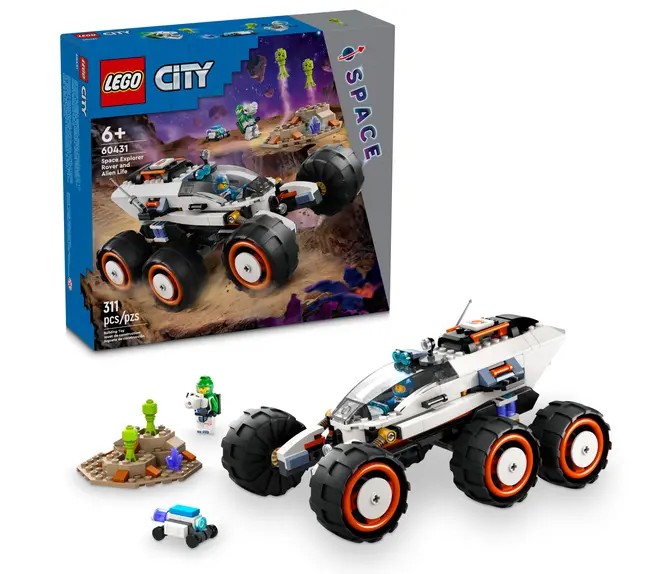 Navigating new worlds is child’s play with this LEGO® City Space Explorer Rover and Alien Life toy playset (60431) for ages 6+. The tough space exploration vehicle is equipped with 6 big tires and advanced suspension for cruising over rocky planetterrain. Kids can join the crew as they map the planet surface and discover strange steam-jetting geysers and alien life. This fun set includes 2 space crew minifigures, and robot and alien figures.