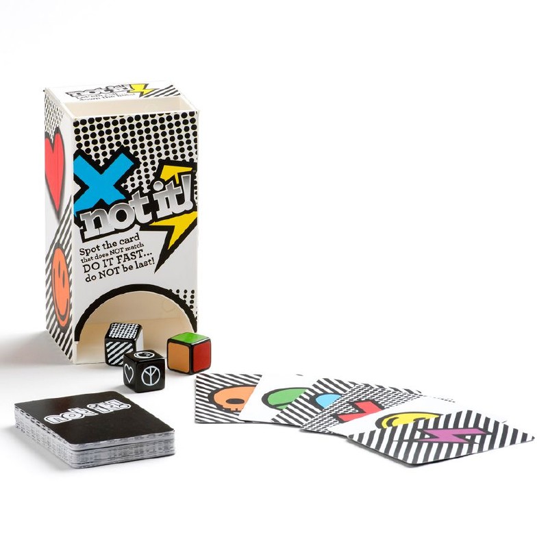 Not It! - is fast and frenzied fun for everyone! When the 3 dice tumble from the dice tower, you must find a card in your hand that does not match any of the 3 attributes on each dice!