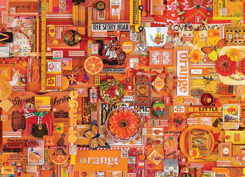 Orange you excited for this tangerine dream of a puzzle? This Shelley Davies original collage is chock-full of carrots, monarch butterfiles, flowers, vintage knick knacks, and of course, a lot of great energy! Orange is one in a series of seven colourful collage puzzles that make up a rainbow theme when all are completed and aligned next to each other.