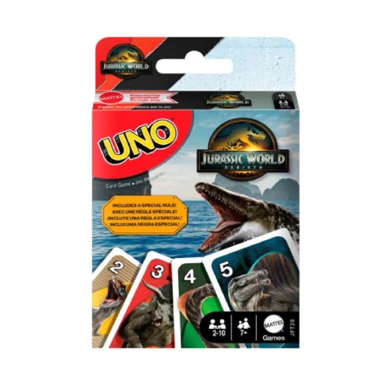 Fans of Jurassic World Rebirth will love playing with this themed UNO card game. With a deck featuring graphics inspired by favorite characters and scenes, players try to match colors and numbers -- there's even a special "Attack of the T. Rex" rule that will have somebody drawing five cards! And when down to a last card, don't forget to snarl "UNO!" Makes a great gift for fans of Jurassic World Rebirth and card game lovers ages 7 years old and up. Colors and decorations may vary.